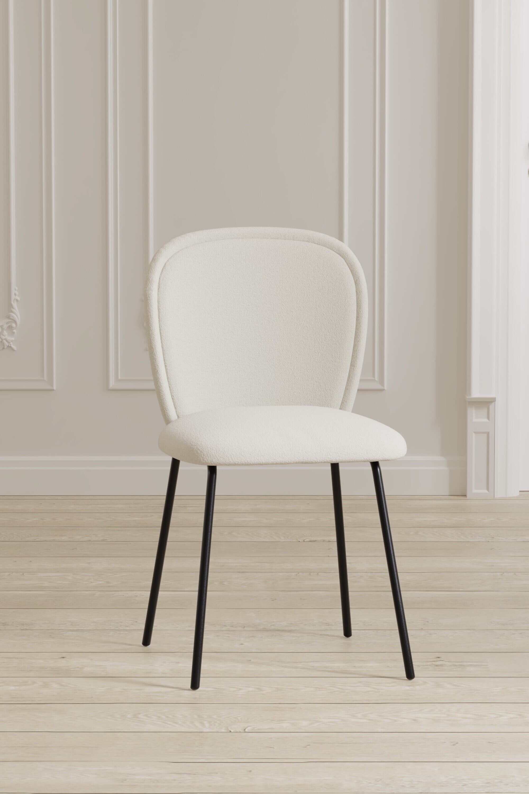 Carl is een strakke eetkamerstoel met een ronde rugleuning en een zachte zitting van crèmekleurig fluweel. De lichte bekleding zorgt voor een elegant contrast met de zwarte poten, waardoor de stoel een tijdloze uitstraling krijgt.